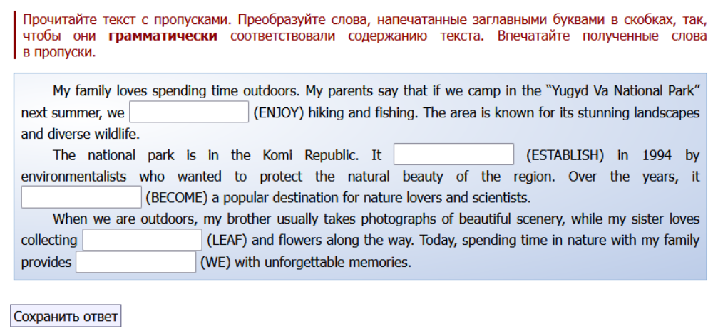 Прочитайте текст с пропусками. Преобразуйте слова, напечатанные заглавными буквами в скобках, так, чтобы они грамматически соответствовали содержанию текста. Впечатайте полученные слова в пропуски. My family loves spending time outdoors. My parents say that if we camp in the «Yugyd Va National Park» next summer, we (ENJOY) hiking and fishing. The area is known for its stunning landscapes and diverse wildlife. The national park is in the Komi Republic. environmentalists It (ESTABLISH) in 1994 by who wanted to protect the natural beauty of the region. Over the years, it (BECOME) a popular destination for nature lovers and scientists. When we are outdoors, my brother usually takes photographs of beautiful scenery, while my sister loves collecting provides (LEAF) and flowers along the way. Today, spending time in nature with my family (WE) with unforgettable memories.