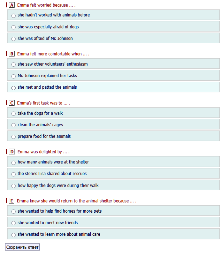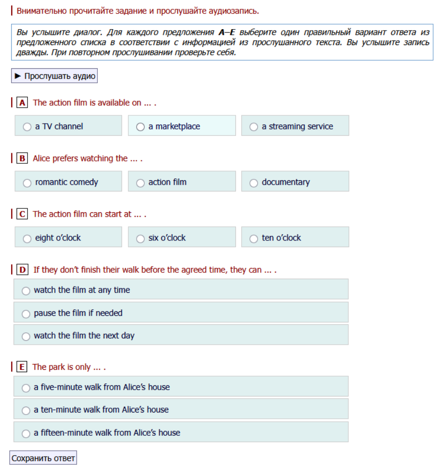 Внимательно прочитайте задание и прослушайте аудиозапись. Вы услышите диалог. Для каждого предложения A-E выберите один правильный вариант ответа из предложенного списка в соответствии с информацией из прослушанного текста. Вы услышите запись Дважды. При повторном прослушивании проверьте себя.