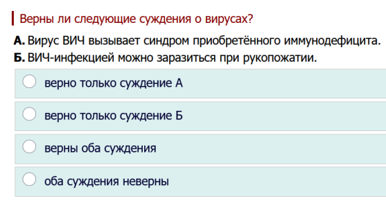 2. Верны ли следующие суждения о вирусах? А. Вирус ВИЧ вызывает синдром приобретённого иммунодефицита. Б. ВИЧ-инфекцией можно заразиться при рукопожатии. верно только суждение А верно только суждение Б верны оба суждения оба суждения неверны.