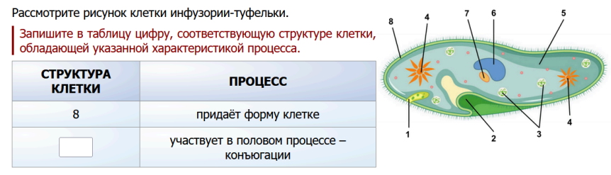 3. Рассмотрите рисунок клетки инфузории-туфельки. Запишите в таблицу цифру, соответствующую структуре клетки, обладающей указанной характеристикой процесса.