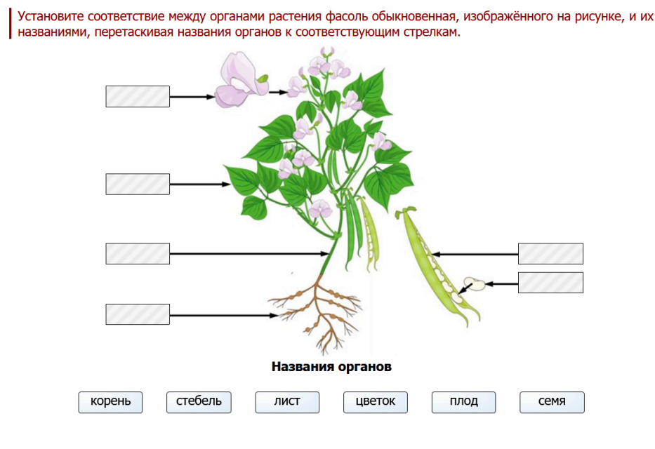 6. Установите соответствие между органами растения фасоль обыкновенная, изображённого на рисунке, и их названиями, перетаскивая названия органов к соответствующим стрелкам.