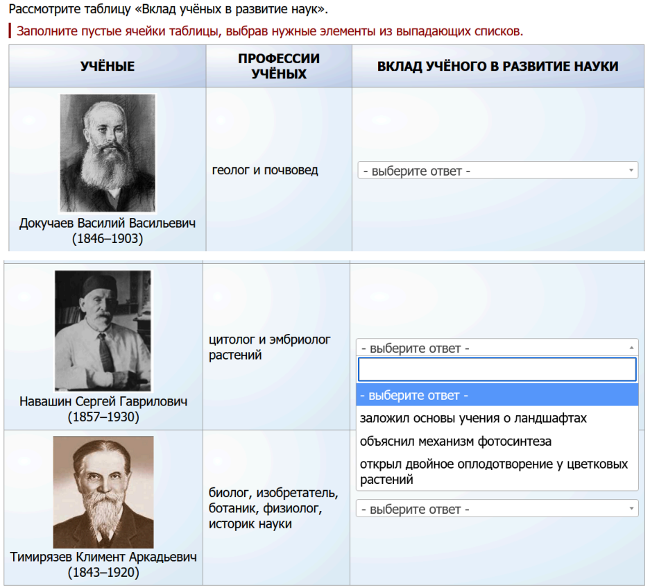 Рассмотрите таблицу «Вклад учёных в развитие наук». Заполните пустые ячейки таблицы, выбрав нужные элементы из выпадающих списков. Выберите три признака изображённого на рисунке объекта. не имеет оформленного ядра органы движения — реснички есть клеточная стенка имеет хроматофор отсутствует большинство органоидов над оболочкой клетки нет слизистой капсулы.