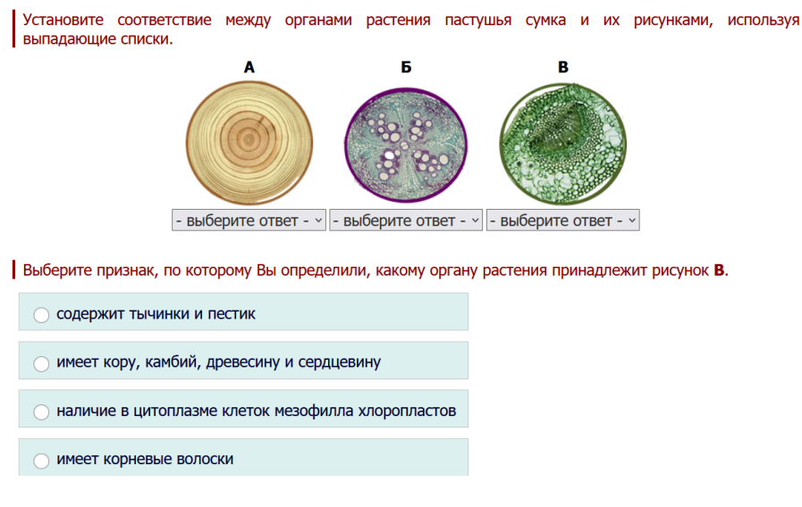 5. Установите соответствие между органами растения пастушья сумка и их рисунками, используя выпадающие списки. Выберите признак, по которому Вы определили, какому органу растения принадлежит рисунок В. содержит тычинки и пестик имеет кору, камбий, древесину и сердцевину наличие в цитоплазме клеток мезофилла хлоропластов имеет корневые волоски.