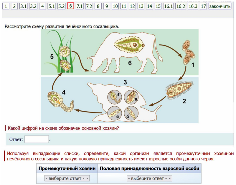 6. Рассмотрите схему развития печёночного сосальщика. Какой цифрой на схеме обозначен основной хозяин? Используя выпадающие списки, определите, какой организм является промежуточным хозяином печёночного сосальщика и какую половую принадлежность имеют взрослые особи данного червя.