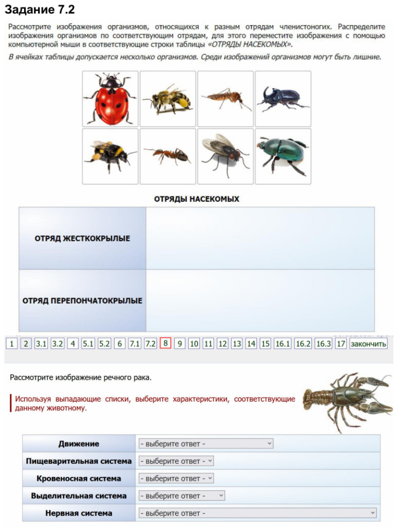 7. Установите соответствие между признаками животных и их систематическими группами животных: к каждому элементу из первого столбца подберите соответствующий элемент из выпадающего списка. Рассмотрите изображения организмов, относящихся к разным отрядам членистоногих. Распределите изображения организмов по соответствующим отрядам, для этого переместите изображения с помощью компьютерной мыши в соответствующие строки таблицы «ОТРЯДЫ НАСЕКОМЫХ». В ячейках таблицы допускается несколько организмов. Среди изображений организмов могут быть лишние.
