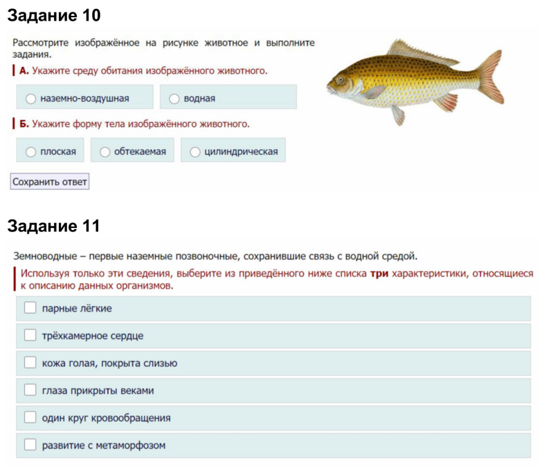 16. Рассмотрите рисунок «Строение пищеварительной системы рыбы». Выберите из выпадающих списков названия органов пищеварительной системы рыбы. Заполните ячейки таблицы «Функции отделов пищеварительной системы рыбы», используя выпадающие списки. Какие особенности внешнего строения являются приспособлением земноводных к обитанию в водной среде? Выберите два верных ответа.