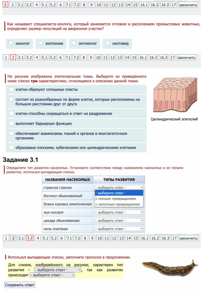 3. Определите тип развития насекомых. Установите соответствие между названиями насекомых и их типами развития, используя выпадающие списки.
