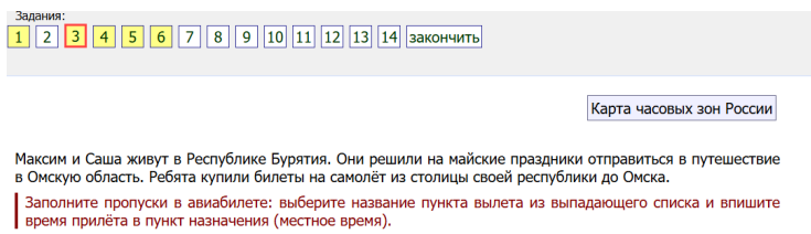 3. Максим и Саша живут в Республике Бурятия. Они решили на майские праздники отправиться в путешествие в Омскую область. Ребята купили билеты на самолёт из столицы своей республики до Омска. Заполните пропуски в авиабилете: выберите название пункта вылета из выпадающего списка и впишите время прилёта в пункт назначения (местное время).