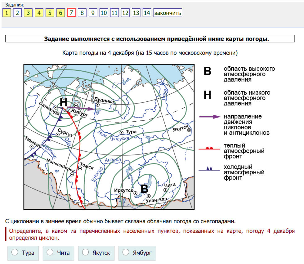 7. С циклонами в зимнее время обычно бывает связана облачная погода со снегопадами. Определите, в каком из перечисленных населённых пунктов, показанных на карте, погоду 4 декабря определял циклон.