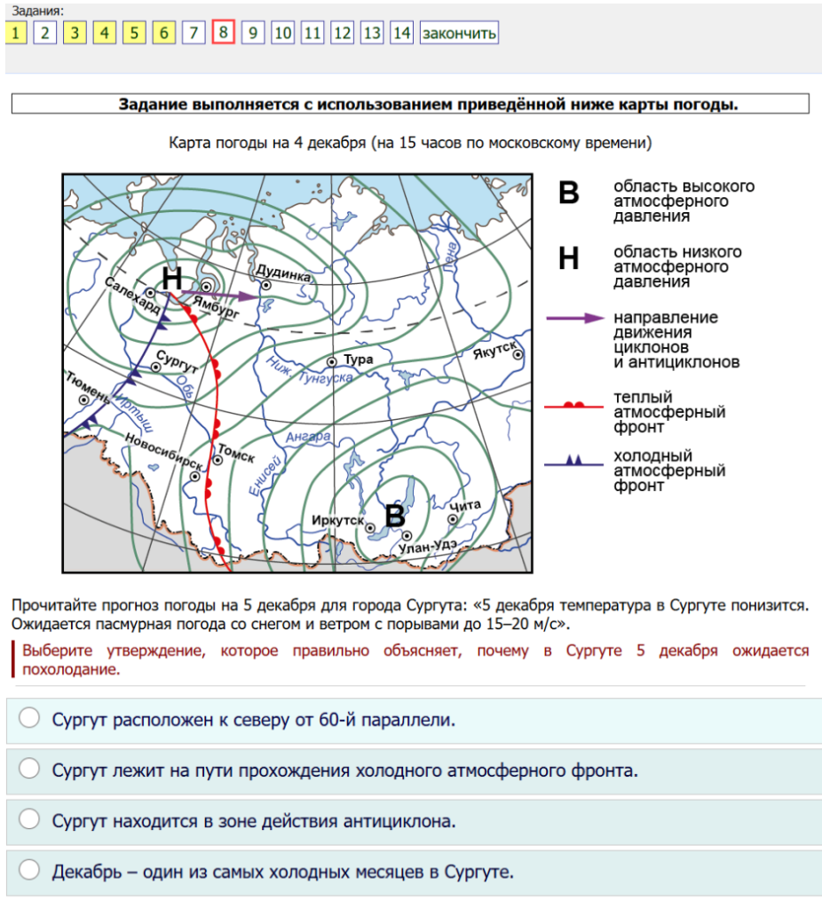 8. Прочитайте прогноз погоды на 5 декабря для города Сургута: «5 декабря температура в Сургуте понизится. Ожидается пасмурная погода со снегом и ветром с порывами до 15-20 м/с». Выберите утверждение, которое правильно объясняет, почему в Сургуте 5 декабря ожидается похолодание. Сургут расположен к северу от 60-й параллели. Сургут лежит на пути прохождения холодного атмосферного фронта. Сургут находится в зоне действия антициклона. Декабрь — один из самых холодных месяцев в Сургуте.