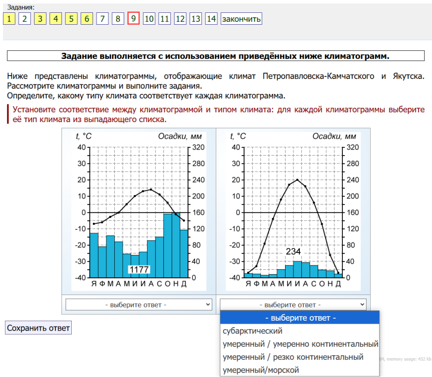 9. Ниже представлены климатограммы, отображающие климат Петропавловска-Камчатского и Якутска. Рассмотрите климатограммы и выполните задания. Определите, какому типу климата соответствует каждая климатограмма. Установите соответствие между климатограммой и типом климата: для каждой климатограммы выберите её тип климата из выпадающего списка.