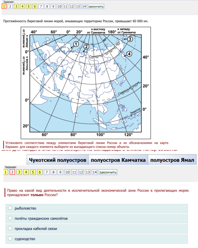 1. Протяжённость береговой линии морей, омывающих территорию России, превышает 60 000 км. Установите соответствие между элементами береговой линии России и их обозначениями на карте Евразии: для каждого элемента выберите из выпадающего списка номер объекта.