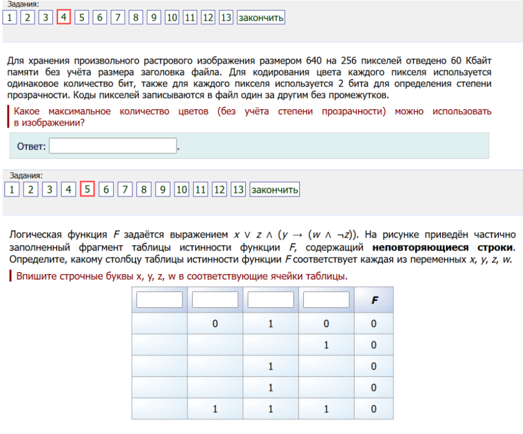 5. Логическая функция F задаётся выражением x v z л (у → (w л 2)). На рисунке приведён частично заполненный фрагмент таблицы истинности функции F, содержащий неповторяющиеся строки. Определите, какому столбцу таблицы истинности функции F соответствует каждая из переменных х, y, z, w. Впишите строчные буквы x, y, z, w в соответствующие ячейки таблицы.