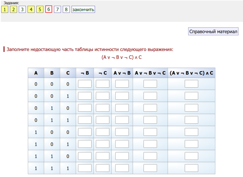 6. Заполните недостающую часть таблицы истинности следующего выражения: Справочный материал (AvBv C) AC.