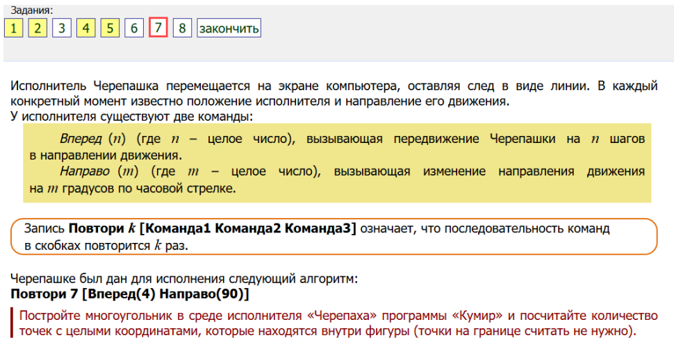 7. Исполнитель Черепашка перемещается на экране компьютера, оставляя след в виде линии. В каждый конкретный момент известно положение исполнителя и направление его движения. У исполнителя существуют две команды: Вперед (1) (где и — целое число), вызывающая передвижение Черепашки на и шагов в направлении движения. Направо (m) (где т — целое число), вызывающая изменение направления движения на т градусов по часовой стрелке. Запись Повтори к [Команда1 Команда2 Команда3] означает, что последовательность команд в скобках повторится к раз. Черепашке был дан для исполнения следующий алгоритм: Повтори 7 (Вперед(4) Направо (90)] Постройте многоугольник в среде исполнителя «Черепаха» программы «Кумир» и посчитайте количество точек с целыми координатами, которые находятся внутри фигуры (точки на границе считать не нужно).