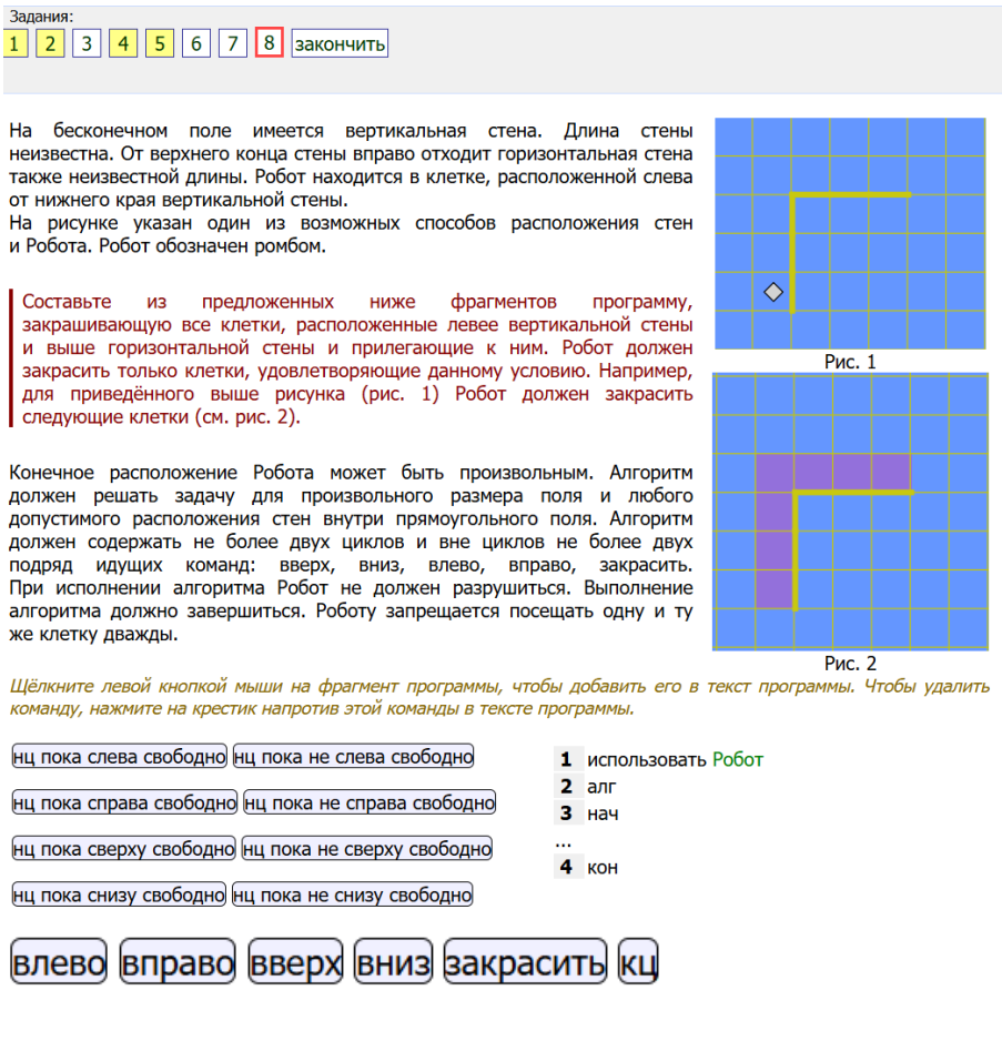 8. На бесконечном поле имеется вертикальная стена. Длина стены неизвестна. От верхнего конца стены вправо отходит горизонтальная стена также неизвестной длины. Робот находится в клетке, расположенной слева от нижнего края вертикальной стены. На рисунке указан один из возможных способов расположения стен и Робота. Робот обозначен ромбом. Составьте из предложенных ниже фрагментов программу, закрашивающую все клетки, расположенные левее вертикальной стены и выше горизонтальной стены и прилегающие к ним. Робот должен закрасить только клетки, удовлетворяющие данному условию.