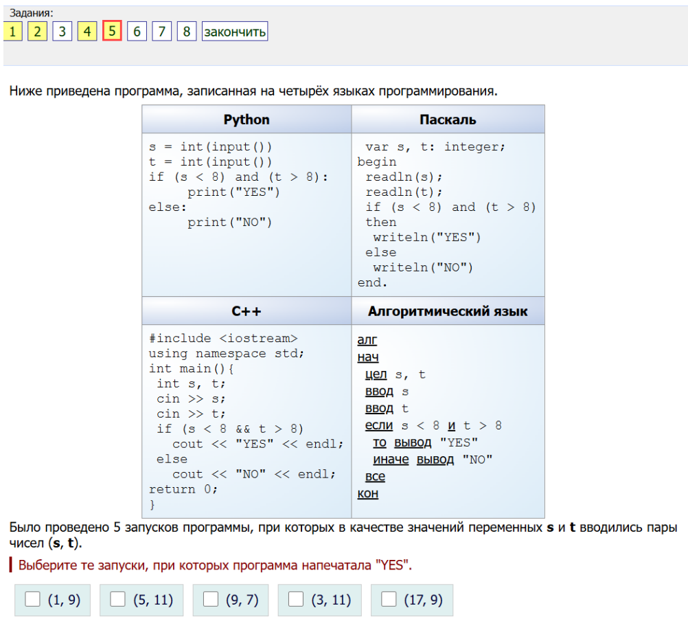 5. Ниже приведена программа, записанная на четырёх языках программирования. Было проведено 5 запусков программы, при которых в качестве значений переменных в и t вводились пары чисел (s, t). Выберите те запуски, при которых программа напечатала «YES».