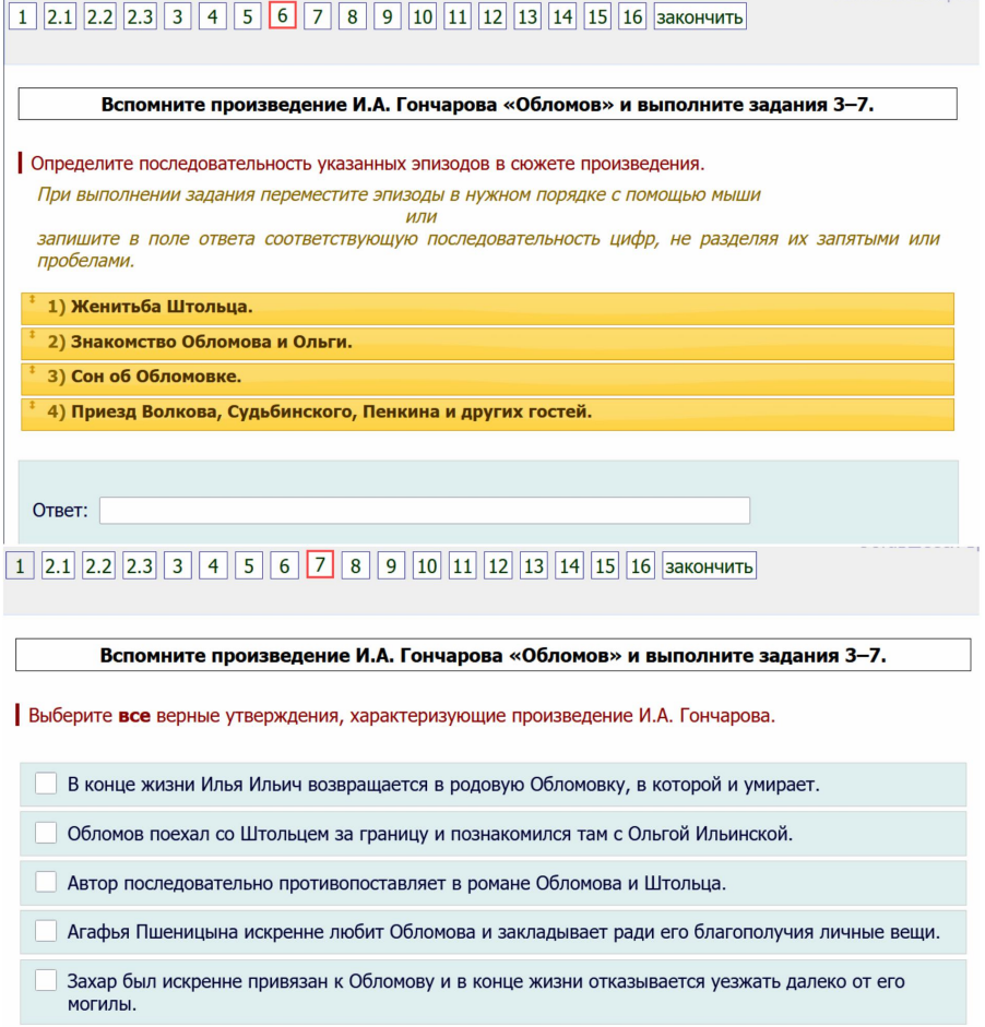 Определите последовательность указанных эпизодов в сюжете произведения. При выполнении задания переместите эпизоды в нужном порядке с помощью мыши или запишите в поле ответа соответствующую последовательность цифр, не разделяя их запятыми или пробелами. 1) Женитьба Штольца. 2) Знакомство Обломова и Ольги. 3) Сон об обломовке. 4) Приезд Волкова, Судьбинского, Пенкина и других гостей.