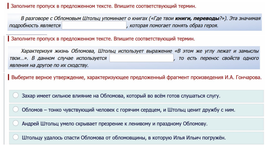 Заполните пропуск в предложенном тексте. Впишите соответствующий термин. В разговоре с Обломовым Штольц упоминает о книгах («Где твои книги, переводы?»). Эта значимая подробность является , которая помогает понять образ героя.