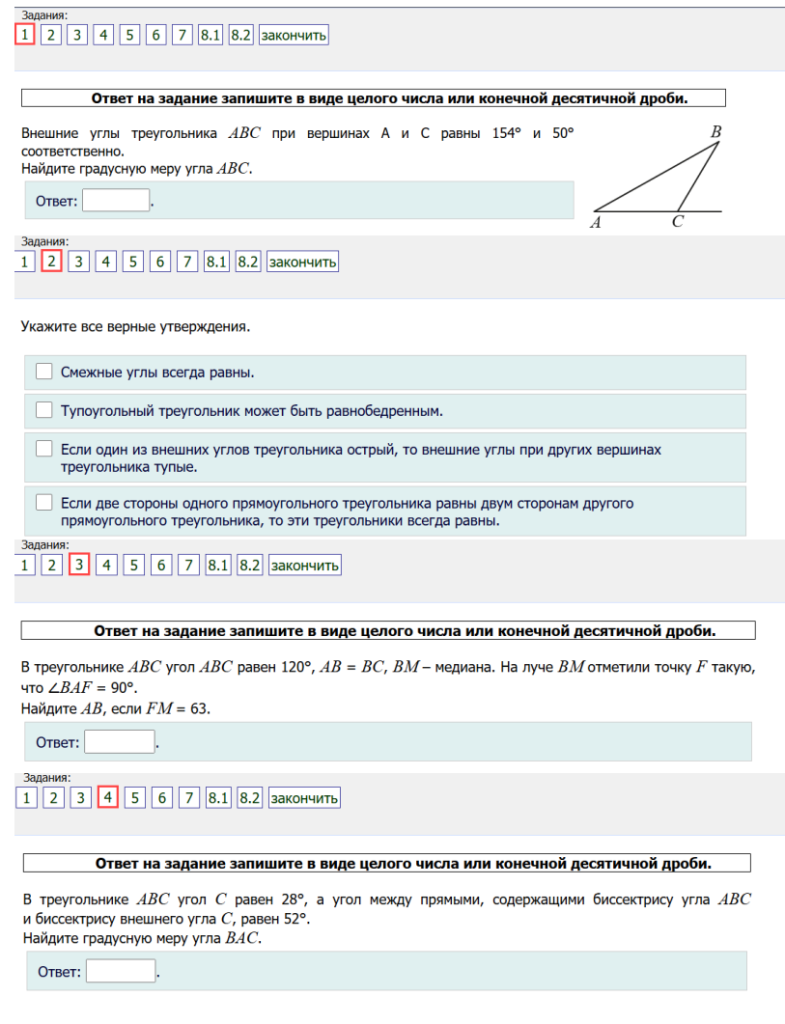 1. Внешние углы треугольника АВС при вершинах А и С равны 154° и 50° соответственно. Найдите градусную меру угла АВС.