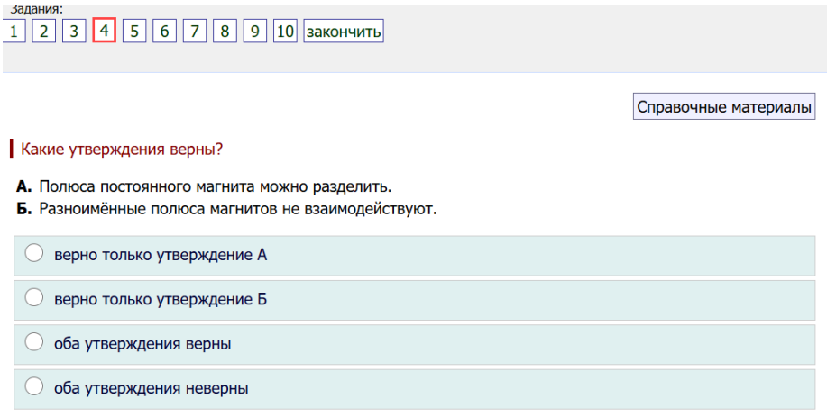 4. Какие утверждения верны? А. Полюса постоянного магнита можно разделить. Б. Разноимённые полюса магнитов не взаимодействуют.