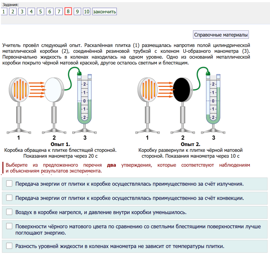 8. Учитель провёл следующий опыт. Раскалённая плитка (1) размещалась напротив полой цилиндрической металлической коробки (2), соединённой резиновой трубкой с коленом U-образного манометра (3). Первоначально жидкость в коленах находилась на одном уровне. Одно из оснований металлической коробки покрыто чёрной матовой краской, другое осталось светлым и блестящим. Передача энергии от плитки к коробке осуществлялась преимущественно за счёт излучения. Передача энергии от плитки к коробке осуществлялась преимущественно за счёт конвекции. Воздух в коробке нагрелся, и давление внутри коробки уменьшилось. Поверхности чёрного матового цвета по сравнению со светлыми блестящими поверхностями лучше поглощают энергию. Разность уровней жидкости в коленах манометра не зависит от температуры плитки.