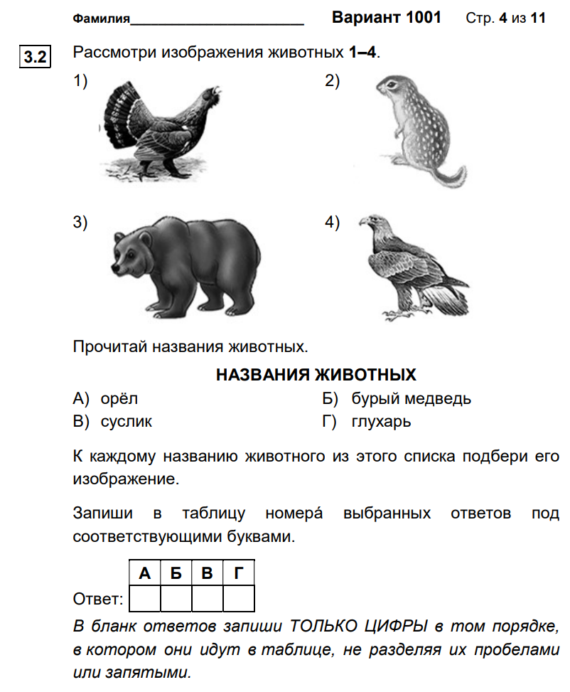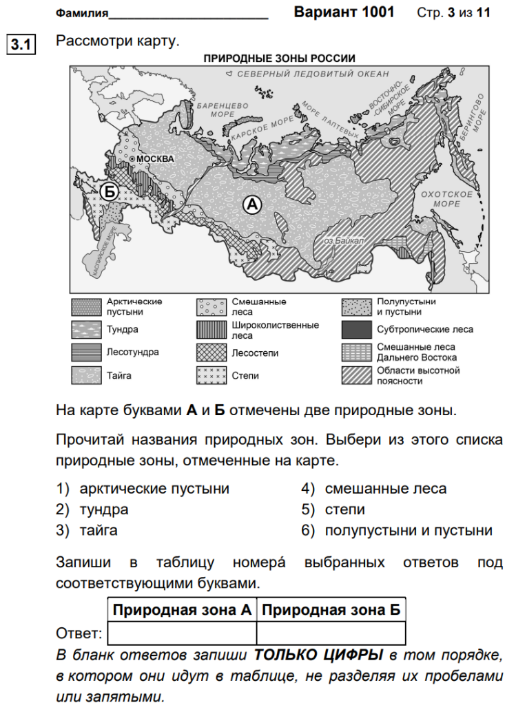 3. Рассмотри карту. На карте буквами А и Б отмечены две природные зоны. Прочитай названия природных зон. Выбери из этого списка природные зоны, отмеченные на карте. 1) арктические пустыни 4) смешанные леса 2) тундра 5) степи 3) тайга 6) полупустыни и пустыни. Рассмотри изображения животных 1–4. А) орёл Б) бурый медведь В) суслик Г) глухарь