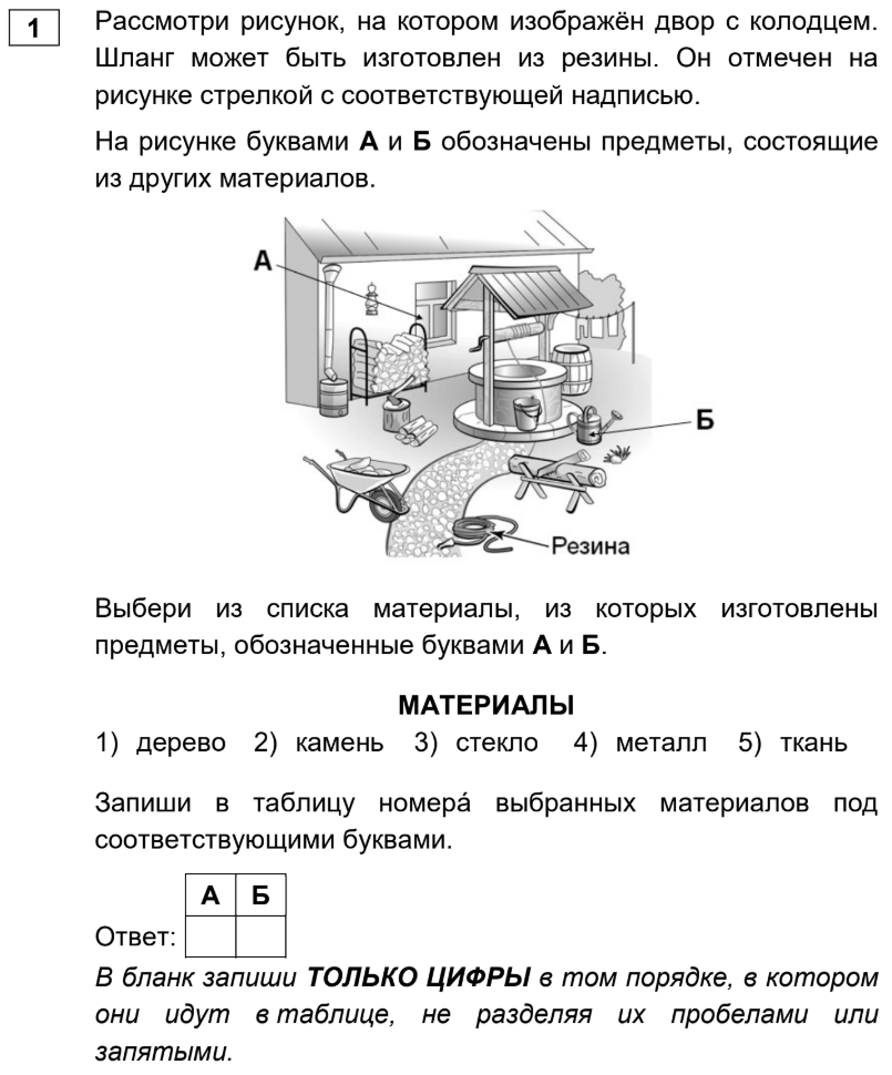 1. Рассмотри рисунок, на котором изображён двор с колодцем. Шланг может быть изготовлен из резины. Он отмечен на рисунке стрелкой с соответствующей надписью. На рисунке буквами А и Б обозначены предметы, состоящие из других материалов. Выбери из списка материалы, из которых изготовлены предметы, обозначенные буквами А и Б. 1) дерево 2) камень 3) стекло 4) металл 5) ткань Запиши в таблицу номера́ выбранных материалов под соответствующими буквами.