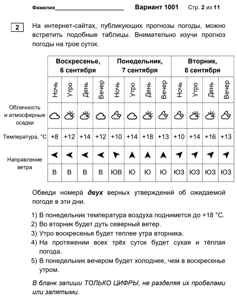 2. На интернет-сайтах, публикующих прогнозы погоды, можно встретить подобные таблицы. Внимательно изучи прогноз погоды на трое суток. Обведи номера́ двух верных утверждений об ожидаемой погоде в эти дни. 1) В понедельник температура воздуха поднимется до +18 °С. 2) Во вторник будет дуть северный ветер. 3) Утро воскресенья будет теплее утра вторника. 4) На протяжении всех трёх суток будет сухая и тёплая погода. 5) В понедельник вечером будет холоднее, чем в воскресенье утром.