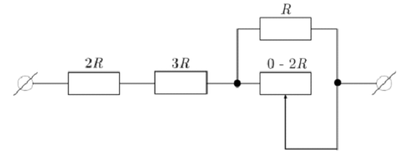 3. Участок цепи, схема которого приведена на рисунке, состоит из трёх резисторов, номиналы которых кратны R=0.8 кОм, и реостата, сопротивление которого может меняться в диапазоне от 0 до 2R. На концах участка поддерживается постоянное напряжение. Ползунок реостата находится в среднем положении, а через резистор 2R протекает ток силой I=40 мА.