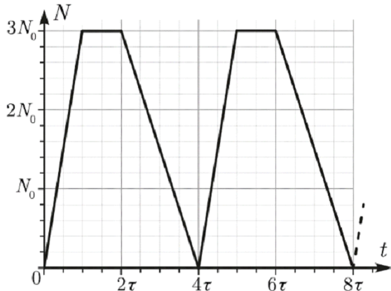 1. В калориметр экспериментатора Глюка встроен нагревательный элемент. Выделявшаяся в ходе эксперимента на элементе мощность менялась во времени по сложному закону с периодичностью 4τ. Считайте, что N0=80 Вт, а τ=20 с. Тепловые потери во всех вопросах, кроме последнего, не учитывайте.