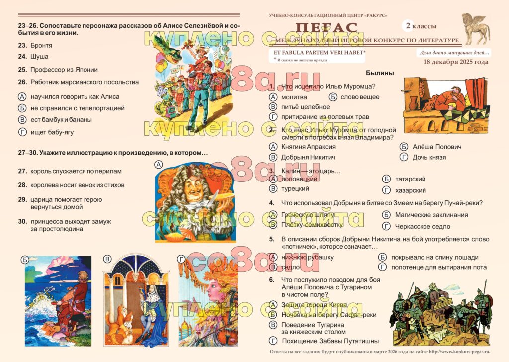 Ответы на все задания для 2 класса Пегас 18 декабря 2025 литературный конкурс по литературе. Для выполнения 30 заданий олимпиады отводится 45 минут. На каждый вопрос необходимо выбрать один из четырёх предложенных вариантов ответа.