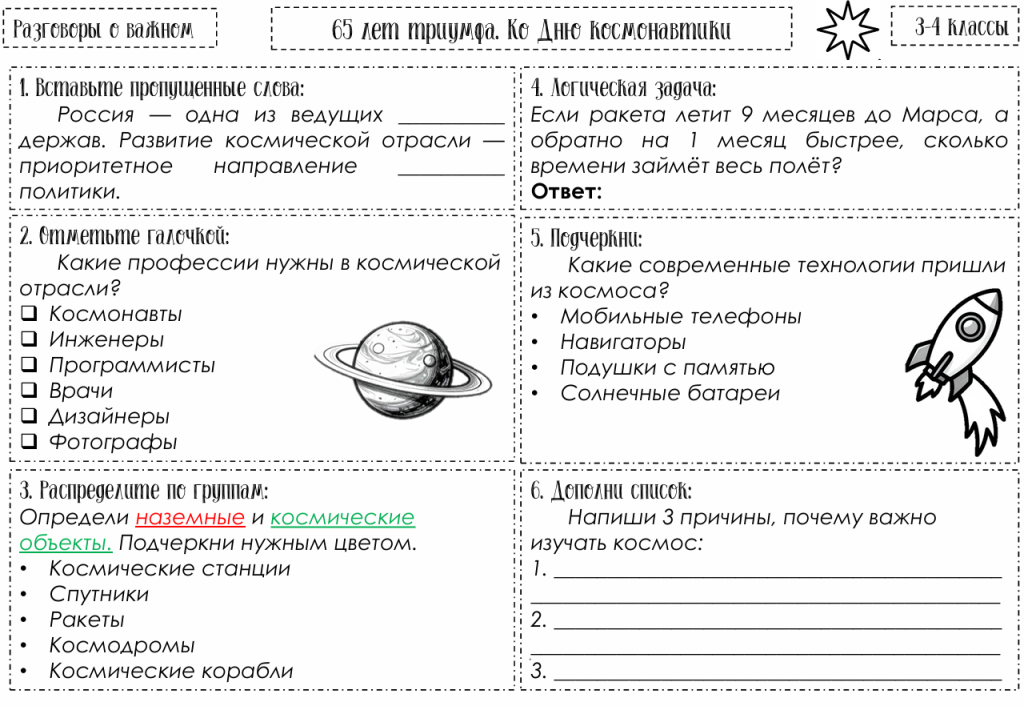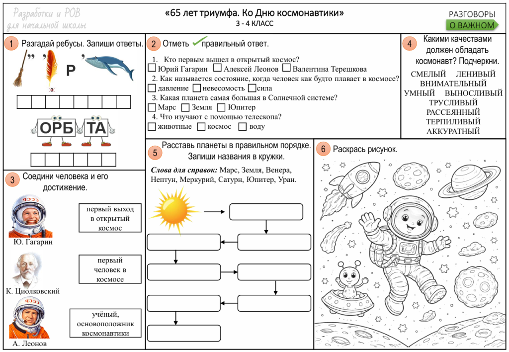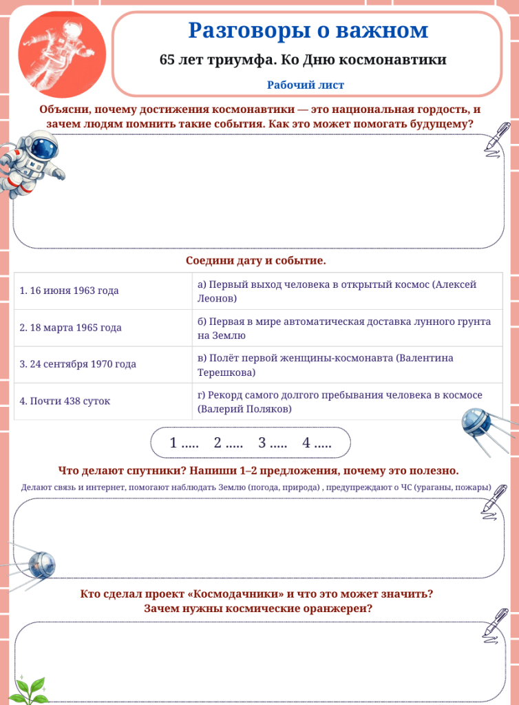 Бесплатные рабочие листы и оформление для классного часа разговоры о важном 6 апреля 2026 на тему 65 лет триумфа ко Дню космонавтики для 1-2, 3-4, 5-7, 8-9, 10-11 класса и СПО материалы для классного руководителя и педагога. Данное оформление подойдет для школьной доски или стенда.
