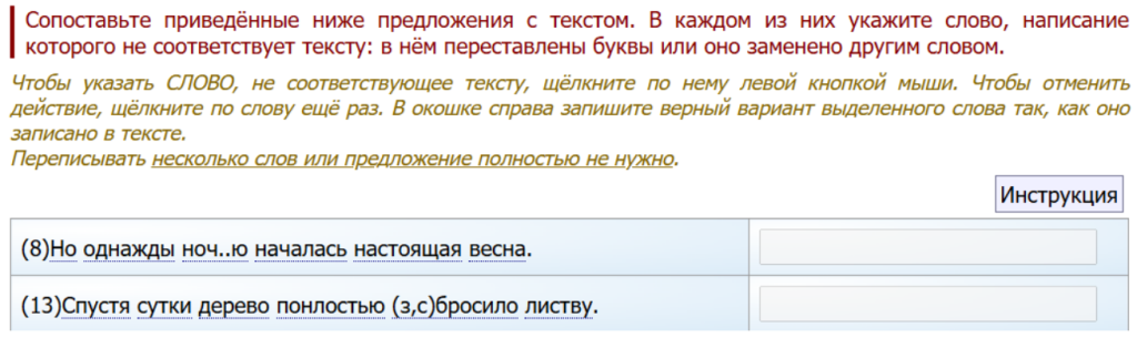 Чтобы указать слово, не соответствующее тексту, щёлкните по нему левой кнопкой мыши. Чтобы отменить действие, щёлкните по слову ещё раз. В окошке справа запишите верный вариант выделенного слова так, как оно записано в тексте. Переписывать несколько слов или предложение полностью не нужно.