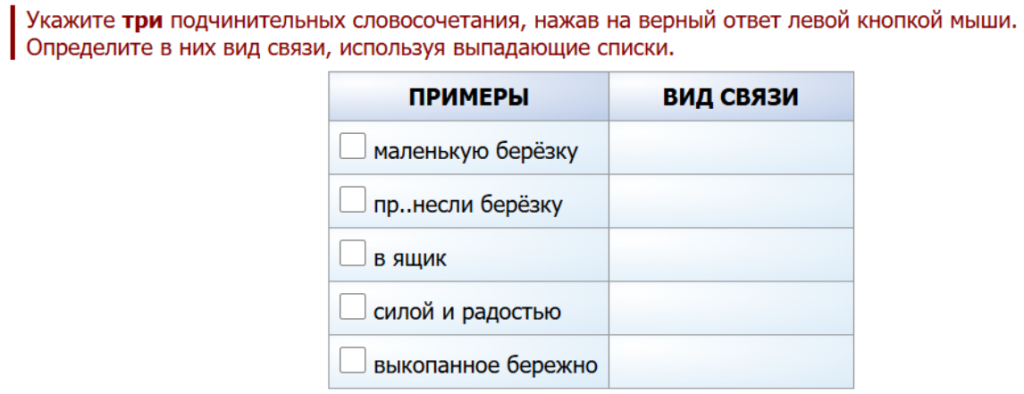 2. Укажите три подчинительных словосочетания, нажав на верный ответ левой кнопкой мыши. Определите в них вид связи, используя выпадающие списки.