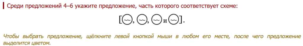 Среди предложений 1-4 укажите предложение, часть которого соответствует схеме. Чтобы выбрать предложение, щёлкните левой кнопкой мыши в любом его месте, после чего выделится цветом.