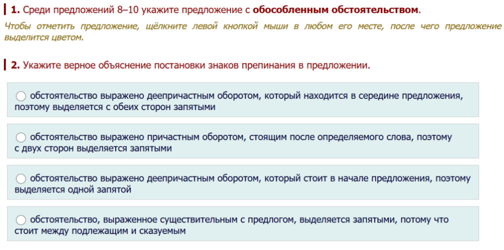 6. Среди предложений 2-4 укажите предложение с обособленным согласованным распространённым определением. Чтобы выбрать предложение, щёлкните левой кнопкой мыши в любом его месте, после чего предложение выделится цветом. 12. Укажите наиболее полное объяснение постановки знаков препинания в этом предложении. Запятая(-ые) ставится (-ятся), потому что ….