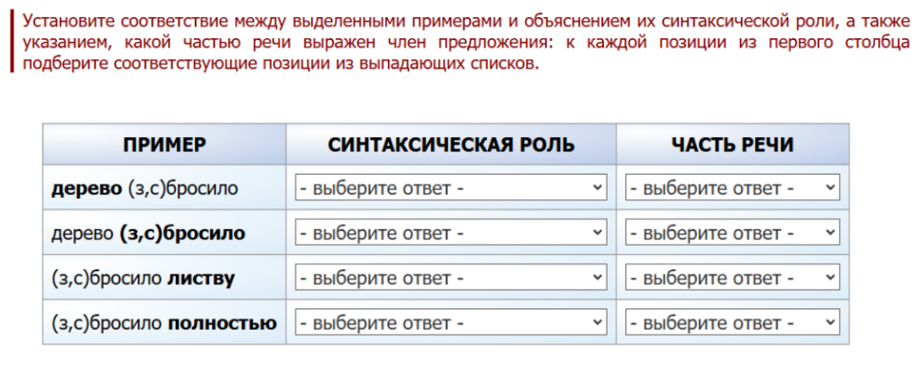 10. Установите соответствие между выделенными примерами и объяснением их синтаксической роли, а также указанием, какой частью речи выражен член предложения: к каждой позиции из первого столбца подберите соответствующие позиции из выпадающих списков.