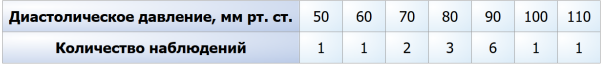 2. Нормальным будем считать диастолическое давление от 60 до 90 мм рт. ст. Пользуясь данными таблицы, определите, какие из следующих утверждений истинны. Студентов с повышенным диастолическим давлением в выборке больше, чем студентов с пониженным давлением. Повышенное диастолическое давление имеет менее четверти студентов. Среднее арифметическое измерений равно 80 мм рт. ст. 10% обследованных студентов имеют пониженное диастолическое давление.